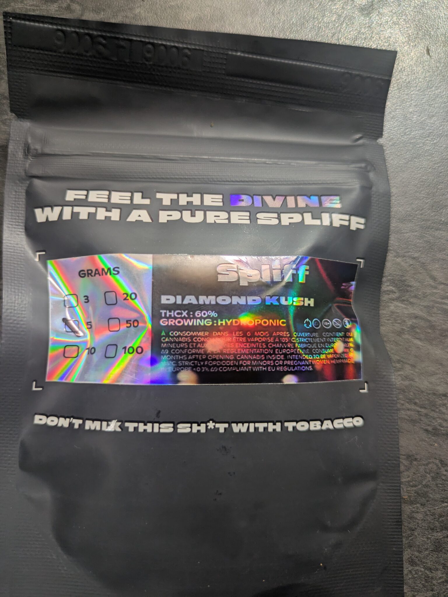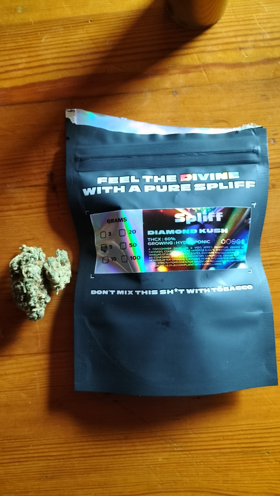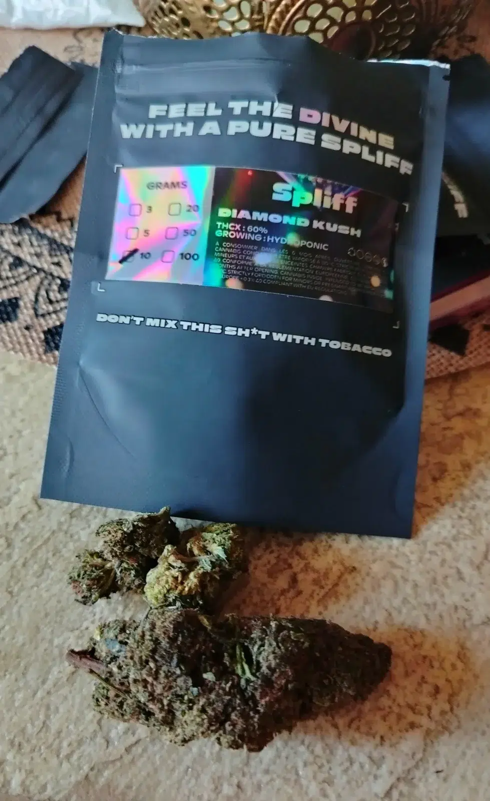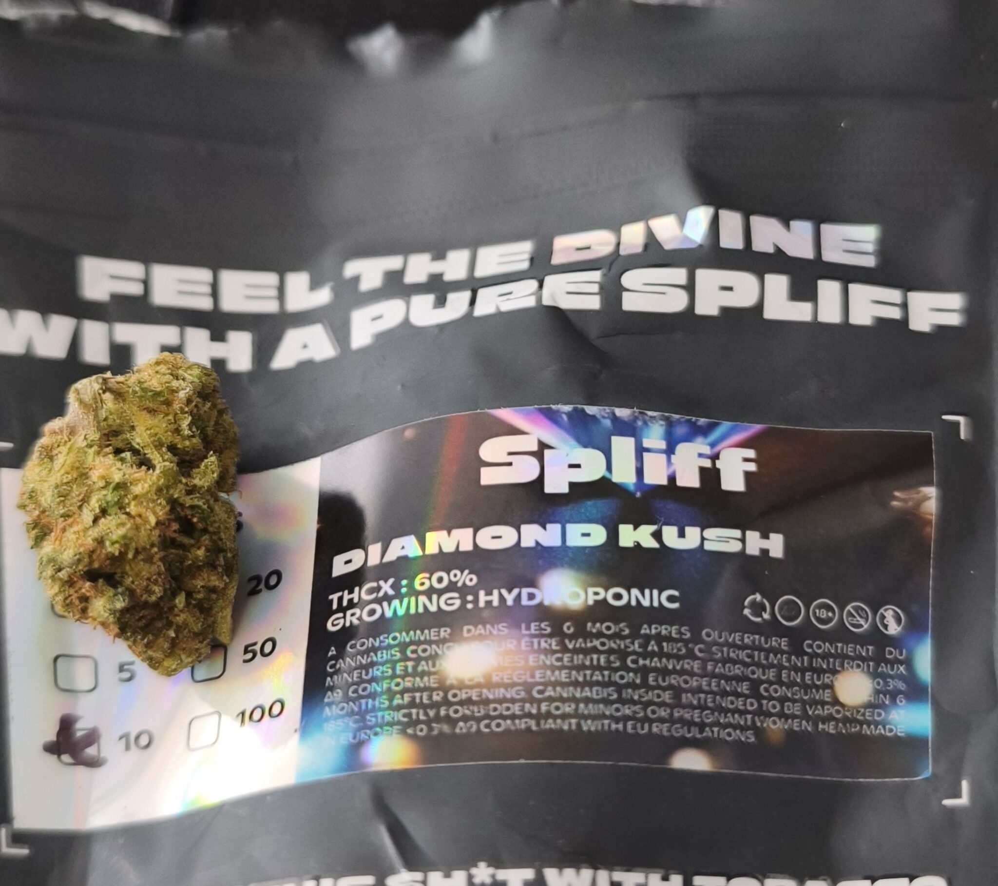Die Diamond Kush THCX ist ein echtes Juwel . Diese hydroponisch angebaute Blüte überzeugt mit dichten, funkelnden Buds . Reife Früchte und Kiefer in der Nase, mit 60% THCX für ein besonders intensives High ✨.